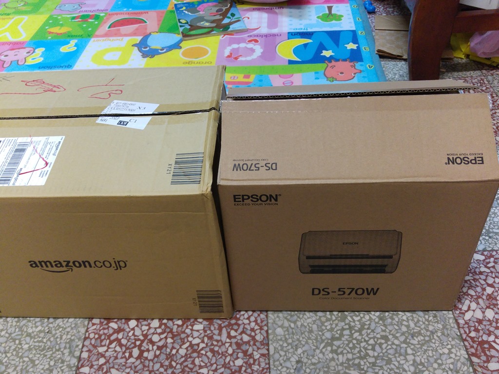 左邊是 amazon 的外箱,右邊的小箱是 epson ds 570w 裝在左邊的外箱裡面,我是已開完箱,懶的放回去了。